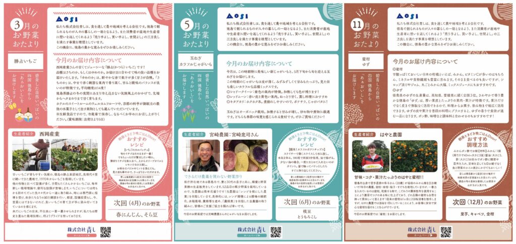 お野菜の特徴や、生産者さんの情報、生産のこだわり、おすすめの調理法や一汁三菜献立など、盛りだくさんの内容です。